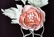 Brooch made of genuine leather, decorated with beads and artificial stones.